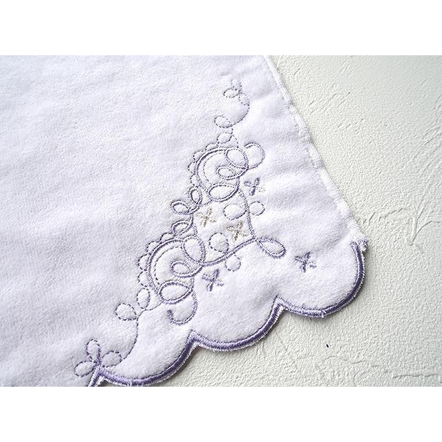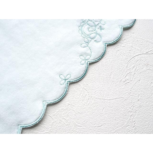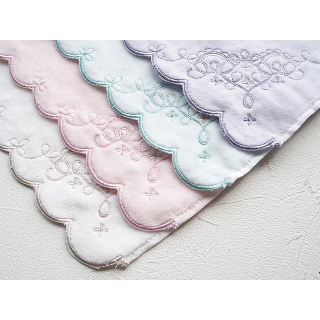 華やかな刺繍とふんわりとしたやさしい色合いの女性らしいタオルハンカチです。グリーン、ピンク、パープル、ホワイトの4色展開。タオルの縁をスカラ刺繍という技法で縁取りしており、細部まで華やかさにこだわったタオルです。