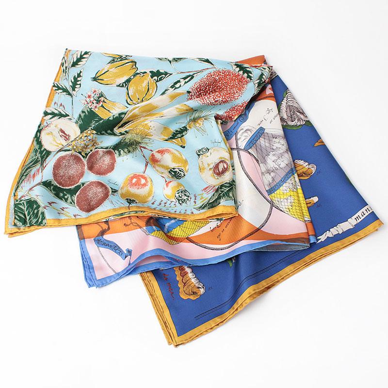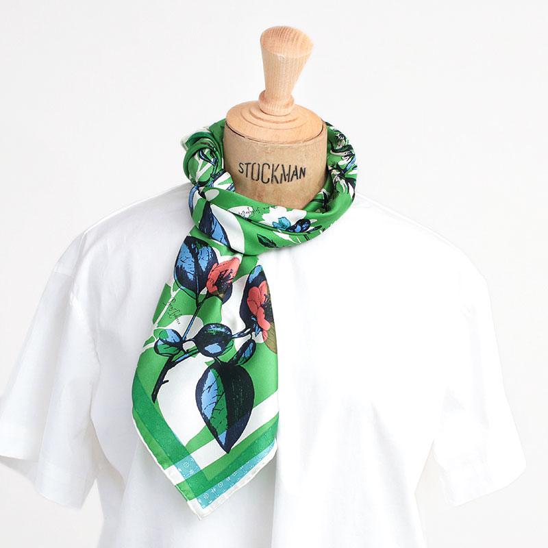 バルーンやフラワー、シェルなど柄も色も可愛くて顔周りが華やかになるスカーフが勢ぞろいです。